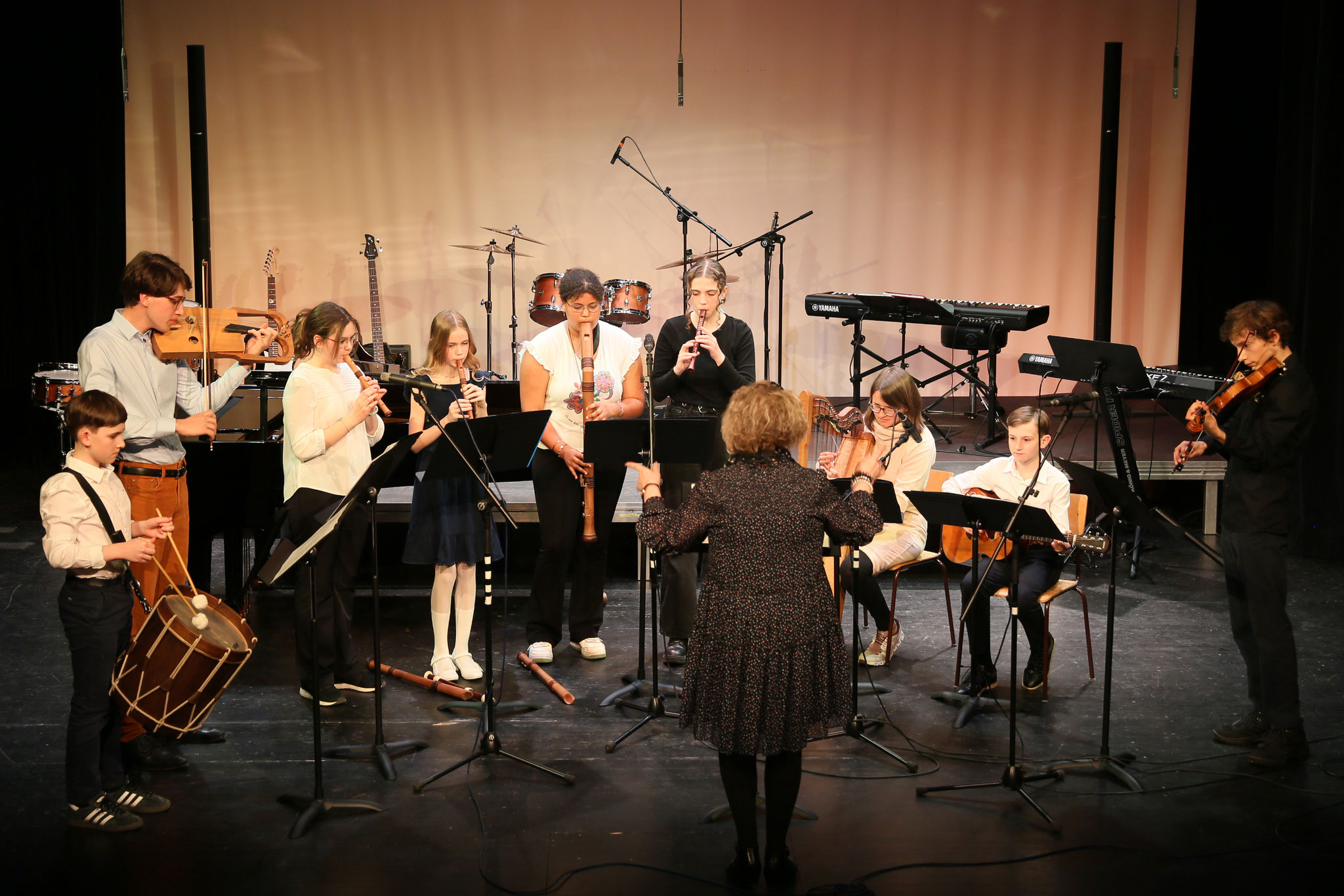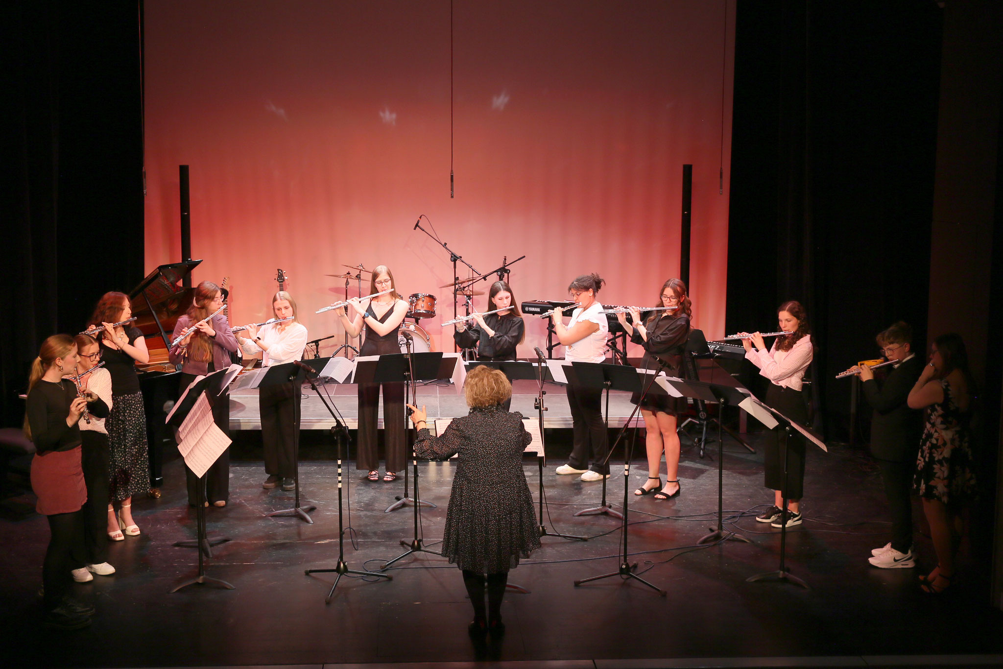 mit ihren Lehrkräften für vorweihnachtliche Stimmung: weihnachtliche Klassik, Christmas Pop und traditionelle Lieder standen auf dem Programm. Streicher- und Querflötenensemble, Gitarrenensemble,